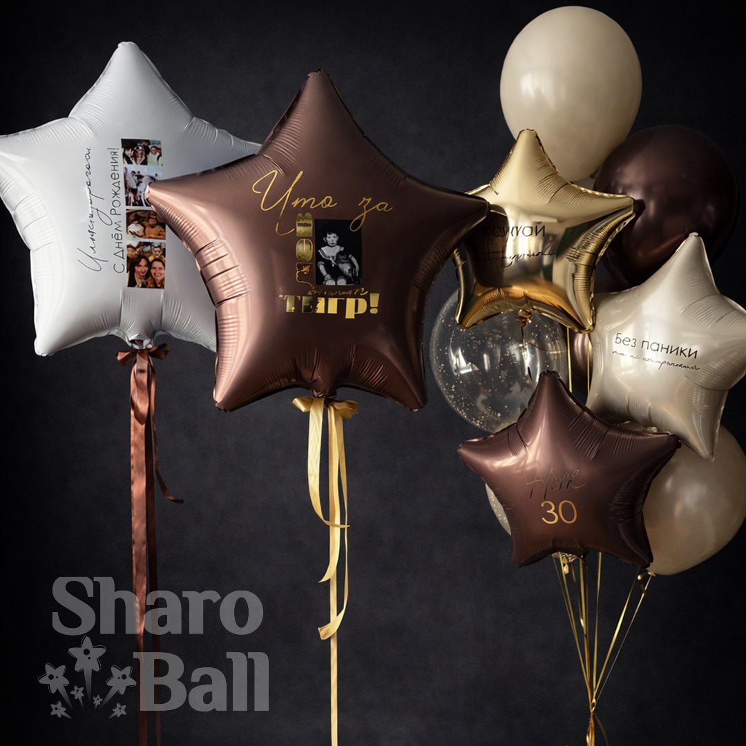 - фонтан- 4 шара пастель, 1 с конфетти, 2 шара хром, 3 звезды 45 см с надписью