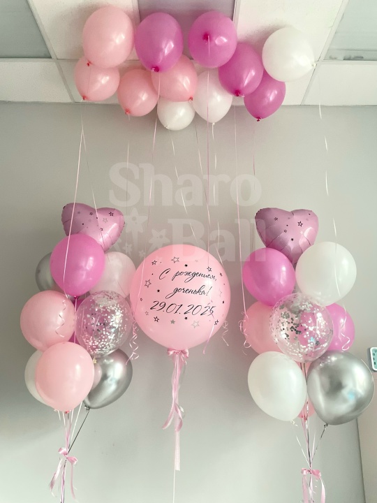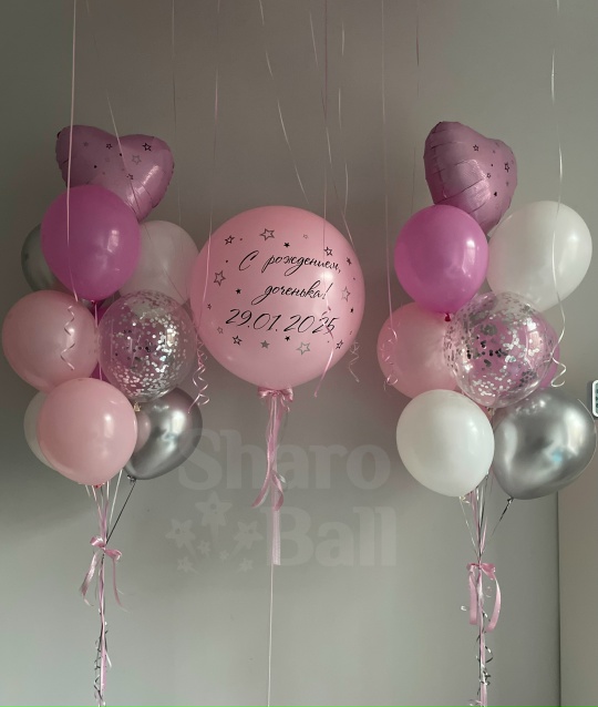 • -2 связки шаров (в каждой: 1 сердце с надписью и принтом, 1 шар с конфетти, 2 шара хром, 6 шаров пастель)